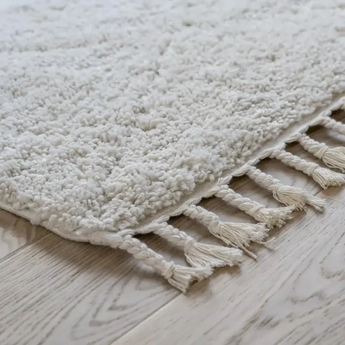 Marrakesh er en tykk og kraftig flosskvalitet med bomulls renning og håndknyttede frynser. Teppet er et ensfarget flossteppe med kelimveving i mønstret som gir en pen struktur i teppet. Mønstret kommer fra Berberstammen Beni Ourain i Atlasfjellene i Marokko.